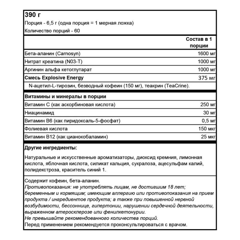Рекомендации по применению: смешайте мерную ложку с 120-240 мл воды и выпейте за 20-30 минут до тренировки. Не превышайте рекомендуемую норму. Не используйте более двух мерных ложек в день. Пейте во время приема достаточное количество жидкости.